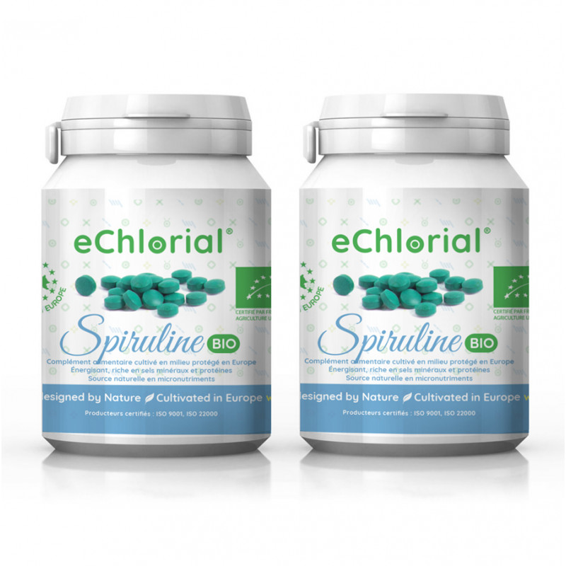 Spirulina eChlorial Bio*: 100% reine, zertifizierte Bio* Spirulina, 400mg (0,4g) Tabletten oder 500 mg je nach Vorrat. Ultrareines Phytoplankton, das in Europa unter kontrollierten natürlichen Bedingungen angebaut wird.